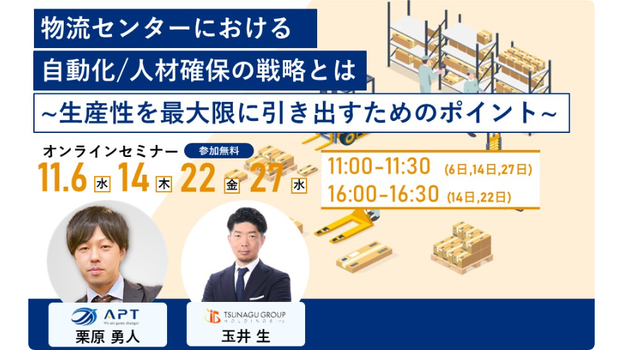 本セミナーでは、人材不足の最前線で課題解決に取り組むツナググループと、物流センターの自動化を進める株式会社APTが登壇し、事例を交えながら自動化による省人化と人材確保の両面から課題解決のポイントをご紹介します。
