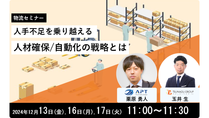 本セミナーでは、人材不足の最前線で課題解決に取り組む株式会社ツナググループ・ホールディングスと、物流センターの自動化を進める株式会社APTが登壇し、事例を交えながら自動化による省人化と人材確保の両面から課題解決のポイントをご紹介します。