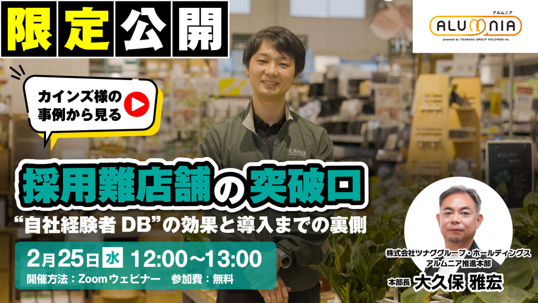 RPO(採用業務代行)・採用コンサルティングを行う株式会社ツナググループ・ホールディングス(本社:東京都中央区、代表取締役兼執行役員社長:米田光宏)は、2026年2月25日にオンラインセミナー『採用難店舗の突破口、自社経験者DBの効果と導入までの裏側』を開催します。