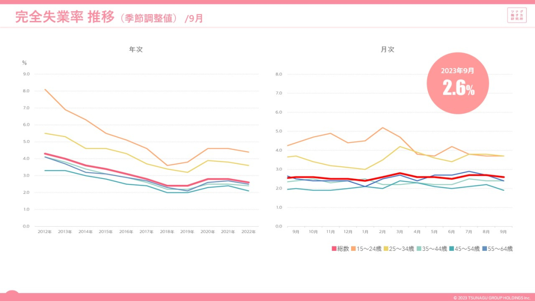 多様な働き方の調査研究機関「ツナグ働き方研究所(拠点:東京都千代田区/所長:平賀充記)」は、官公庁などが発表する労働市場関連のデータをキュレーションしつつ、分かりやすくまとめた「労働市場データレポート」を毎月発表していきます。今回は10月下旬に発表された最新データをもとに2023年9月度レポートについて、とりまとめましたのでご報告いたします。