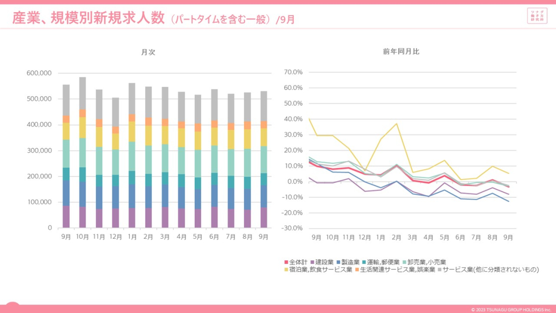 新規求人数の伸び率は前年同月比-3.4%と、8月度は3か月ぶりにプラスに転じましたが、再び減少しています。伸び率がプラスだったのは宿泊業,飲食サービス業(5.2%増)、学術研究,専門・技術サービス業(2.6%増)の2業種のみとなりました。一方で製造業(12.7%減)、建設業(8.1%減)、情報通信業(5.4%減)などは伸び率が前年同月を下回っています。