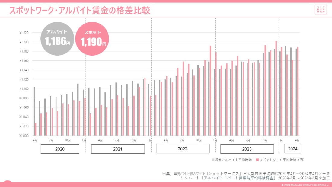 2024年4月度のスポットワーク平均時給(首都圏・関西圏・東海圏の3大都市圏)は1,190円。前月差+29円、前年差+30円となりました。通常のアルバイト平均時給1,186円(※リクルート発表「アルバイト・パート募集時平均時給調査」)との比較では4円高い結果となりました。