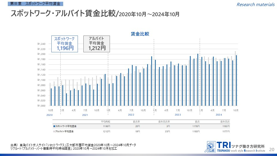 2024年10月度のスポットワーク平均賃金は1,196円(首都圏・関西圏・東海圏の3大都市圏)。前月差+20円、前年差+3円となりました。通常のアルバイト平均賃金は1,212円(※リクルート発表「アルバイト・パート募集時平均時給調査」)との比較では16円安く、アルバイト賃金が上回っています。