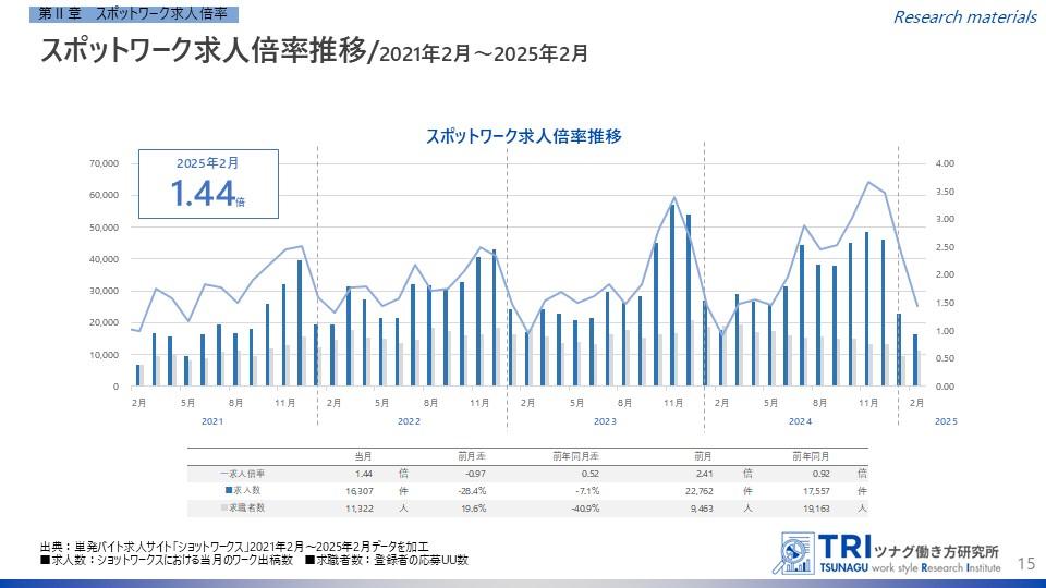 2025年2月度のスポットワーク求人倍率は1.44倍。1月2月にスポット求人数が落ち着くのは例年通りの結果ですが、求人の需要がピークとなる12月と比べて2.03ポイントも下落し、8か月ぶりに1倍を下回りました。前月同月差でみると+0.52ポイントと9か月連続で上昇しています。