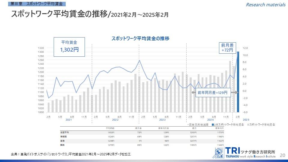 3. スポットワーカーの平均賃金は1,302円。初めて1300円を超え、過去最高額を更新。