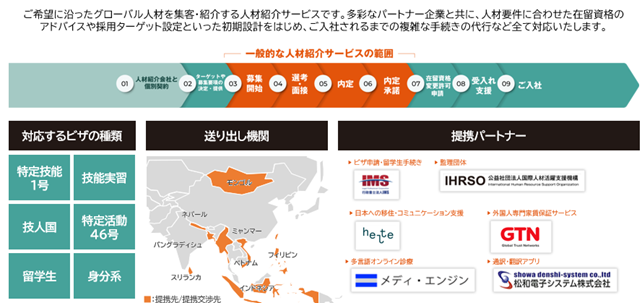 「Global Agent Next」では、「候補者獲得部分」と「採用・入社支援部分」の接点となり、複雑とされる工程を一元化します。すべてを包括的に見ることで、情報や施策の分断を起こさず、採用戦略に沿った最適なマッチングが実現できます。従来から連携を構築してきた多彩なパートナー企業と協力し、国内外の人材に対応。豊富な在留資格に加え、複数の国の送り出し機関とも提携可能です。