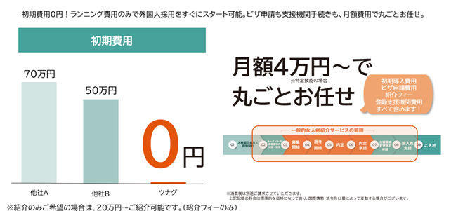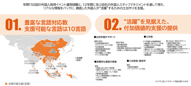 ツナググループでは年間150回もの外国人材採用イベントを運営し、また、自社の外国人スタッフにおいても12年間にわたりマネジメントを行ってきました。現場で得たリアルな情報と実績をもとに、外国人材が“活躍”するための土台作りを徹底して支援するため、本サービスの構築に至りました。