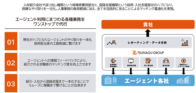 RPO(採用業務代行)・採用コンサルティングを行う株式会社ツナググループ・ホールディングス(本社:東京都中央区、代表取締役社長:米田光宏、以下「ツナググループ」)は、日本の社会課題である2030年約50億時間の労働需給ギャップ解消に向け、外国人材の採用から活躍するまでの土台をトータル支援する人材紹介サービス「Global Agent Next」を開始しました。多彩なパートナー企業と連携し、人材要件に合わせた在留資格のアドバイスや採用ターゲット設定といった初期設計から入社するまでの複雑な手続き、入社後のサポートまで万全に対応し、企業の採用課題を根本から解決します。