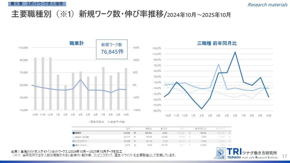 2025年10月度の新規ワーク数は76,845件となり、前年同月比で18.2%減少となりました。これにより、6か月連続で前年同月を下回る結果となっています。