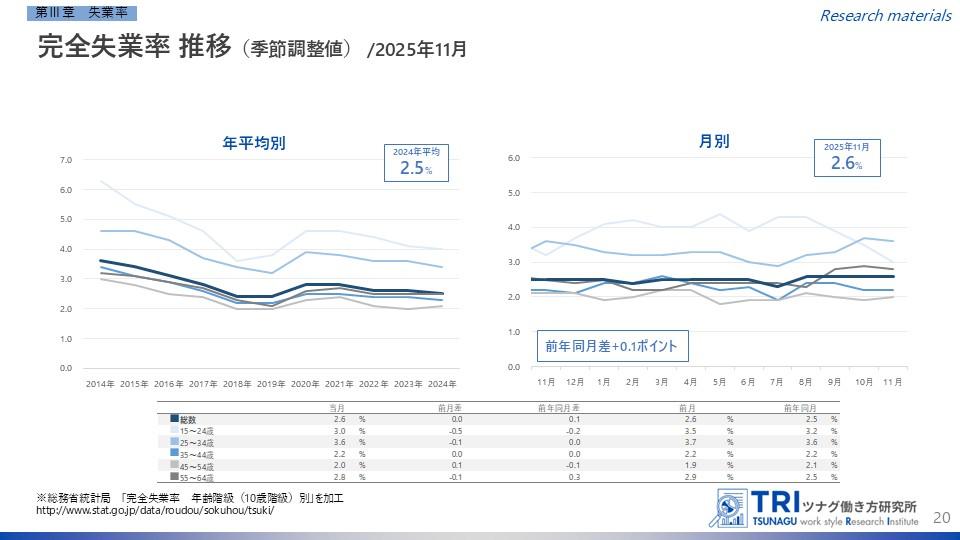 2025年11月の完全失業率(季節調整値)は2.6%となり、前月と同水準。前年同月差では0.1ポイント上昇しています。
