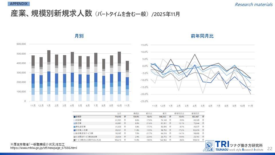RPO(採用業務代行)・採用コンサルティングを行う株式会社ツナググループ・ホールディングス(本社:東京都中央区、代表取締役兼執行役員社長:米田光宏、以下「ツナググループ」)を母体とする、多様な働き方の調査研究機関「ツナグ働き方研究所(拠点:東京都港区、所長:大野 博司)」は、官公庁などが発表する労働市場関連のデータをキュレーションしつつ、分かりやすくまとめた「労働市場データレポート」を毎月発表しています。今回は12月下旬に発表された最新データをもとに2025年11月度のレポートについて、とりまとめましたのでご報告いたします。